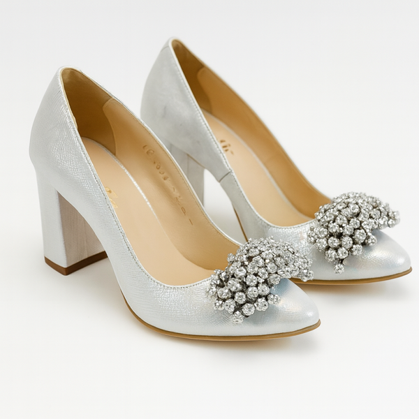 Zilveren schoenen van echt leer met patroon en zilveren accessoire