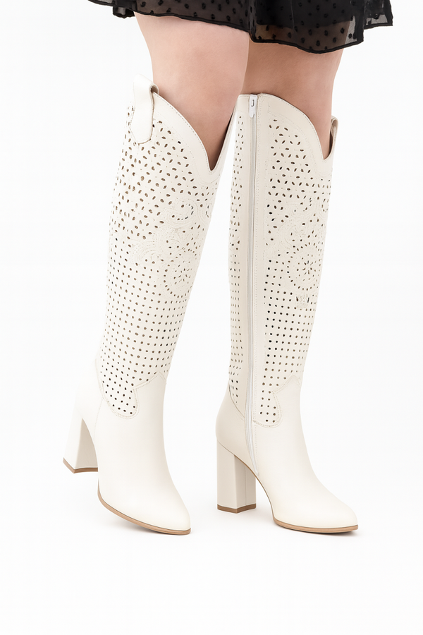Stijlvol en modern – deze witte leren laarzen zijn prachtig lasergeperforeerd en geven een verfijnde, vrouwelijke uitstraling. Met een handige ritssluiting aan de zijkant en een stabiele hak van 8 cm combineren ze elegantie met comfort. De beige zool, spitse neus en leren voering maken het ontwerp compleet.