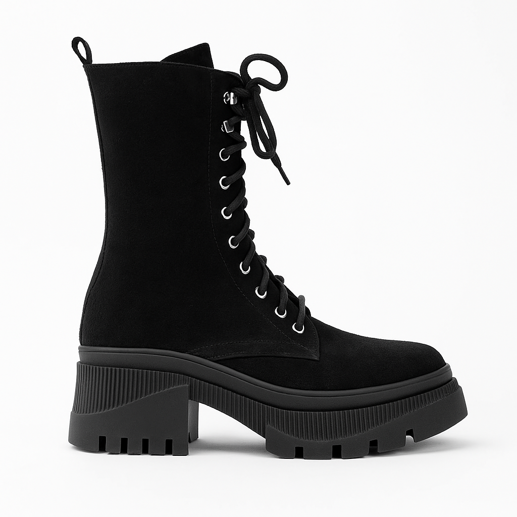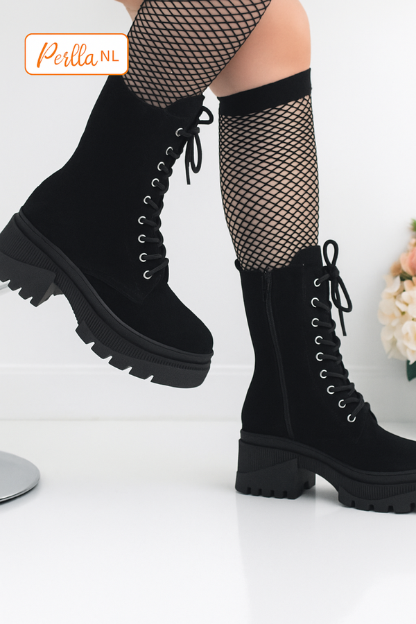 Laarzen met rits en veters, schachthoogte 18 cmZwarte zool, ronde neusHakhoogte: 6 cm